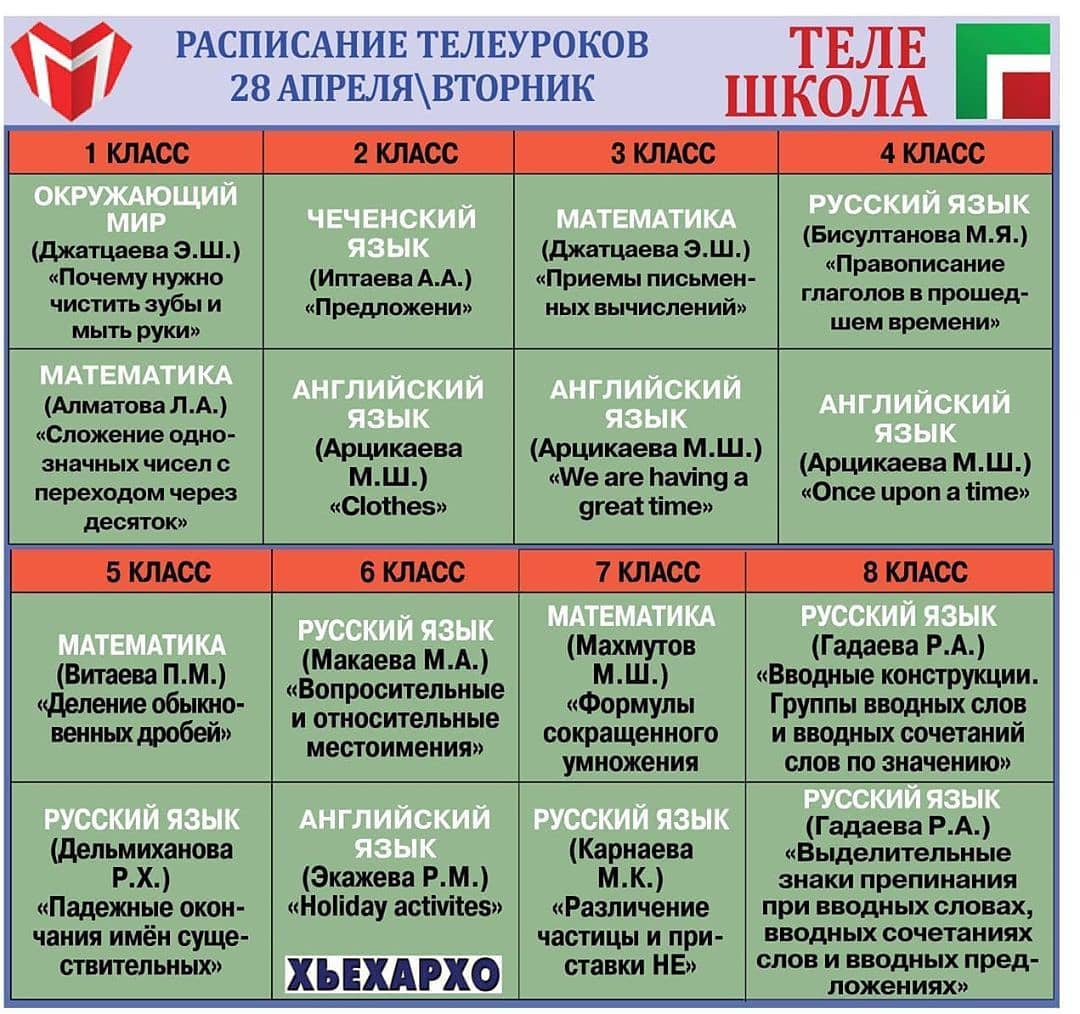 26.04.2020Расписание телеуроков для школьников на вторник 28 апреля. Занятия продолжительностью до 10 минут начинаются в 9.00. Отметим, что все образовательные выпуски телепроекта доступны для просмотра на сайте Министерства образования и науки ЧР по ссылке, указанной в шапке профиля @minobrnauki_95.Напомним, что в эфире ЧГТРК «Грозный» продолжается реализация проекта Министерства образования и науки Чеченской Республики «Телешкола», в ходе которого лучшие учителя республики в процессе занятий не только объясняют наиболее сложные темы, но и помогают школьникам и их родителям сориентироваться в учебной программе.