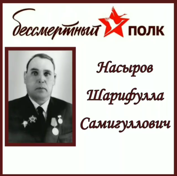 11.05.2020Прадедушка ученицы 9 "Б" класса. Насыров Шарифулла Самигуллович, проходил военную службу в рядах Советской Армии с 15 ноября 1937 г. по 10 ноября 1940 г. Участвовал в Советско-финской войне. Он был мобилизован 10 июня 1941 по 15 мая 1946 года. Военный билет КП — 1637562 выдан Ишимбайским ГВК 22 июня 1941 года. По принятии присяги ему присвоили звание — старшина. С июля по август 1941 года Шарифулла Самигуллович был командиром отделения 93 стрелковой роты полка, а с августа по июнь 1945 - командиром отделения связи 240 стрелковой роты полка. Он был специалистом полевых кабельных линий и начальником телефонных станций; дошёл до Берлина.