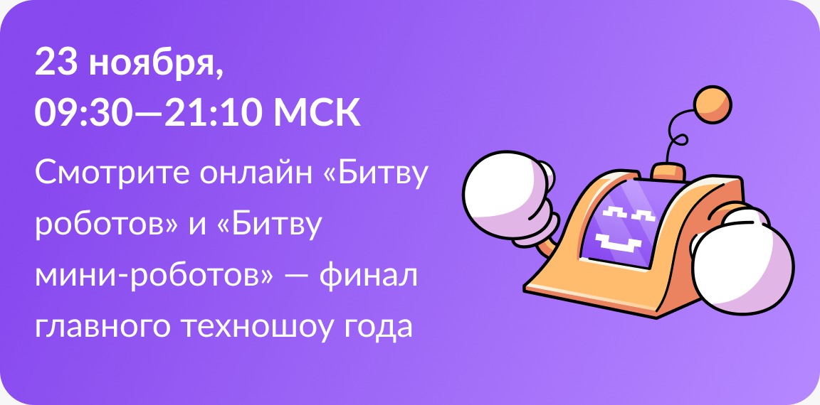 По итогам отборочных этапов 32 сильнейшие команды из России, Беларуси, Индии, Ирана и Китая встретятся в полуфинале Чемпионата, чтобы побороться за звание чемпиона битвы роботов 2024 года. Мероприятиепройдет 23 ноября 2024 г. с 09:30 до 21:10 при поддержке Правительства Московской области на территории ледового дворца «Арена Мытищи» по адресу: Московская область, г. Мытищи, ул. Летная, д. 17.