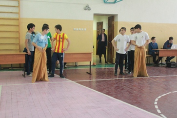 В мероприятии, подготовленном классными руководителями и учителем физкультуры Садуевым Т.Х., приняли участие 10-е классы. Были сформированы команды из 6 человек, выбраны капитаны. Ребята сами определили названия своим командам, эмблемы и девизы. Не менее старались болельщики: придумывали зажигательные «кричалки», рисовали плакаты.